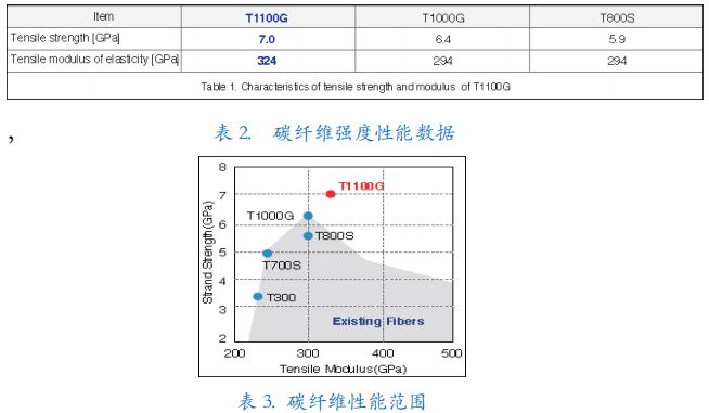 T1100 碳纤维使用了东丽定量技术,达到精细级控制纤维结构。结果是显著的性能改进超过东丽的其他碳纤维,见表 2.和表 3.