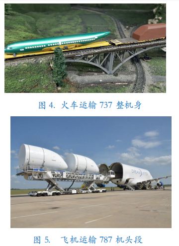 Spirit AeroSystems(美国堪萨斯州的威奇塔)她收购了,波音公司在威奇塔的飞机部件制造厂。目前是世界第一大的飞机部、组件制造公司。其中最突出的是:目前她每月至少要向波音公司 737 在西雅图的伦顿总装厂,提供 50 个 737 整机身。737 整机身用火车,由威奇塔运输到伦顿总装厂(图。4)。每月至少向波音 787 总装厂交付 16-17 架 787 机头段。机头段用飞机运输(图。5)。
